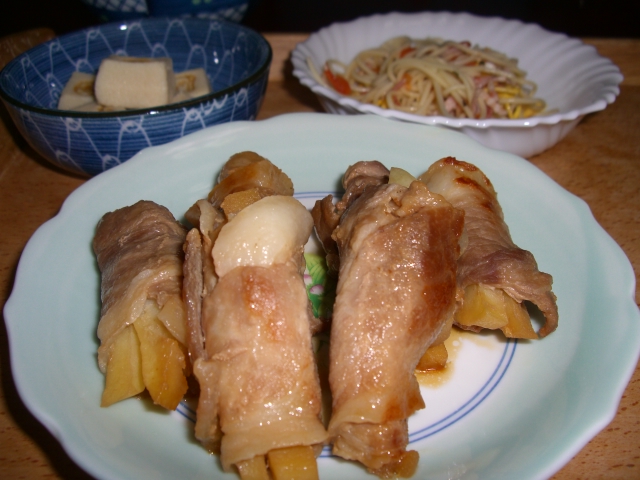 肉巻きポテトは、じゃがいもをレンジでチンしてから巻きました。
