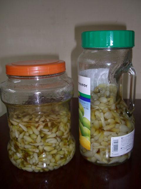 右側のは、らっきょう1kgで市販のらっきょう酢漬けの素で漬けました。