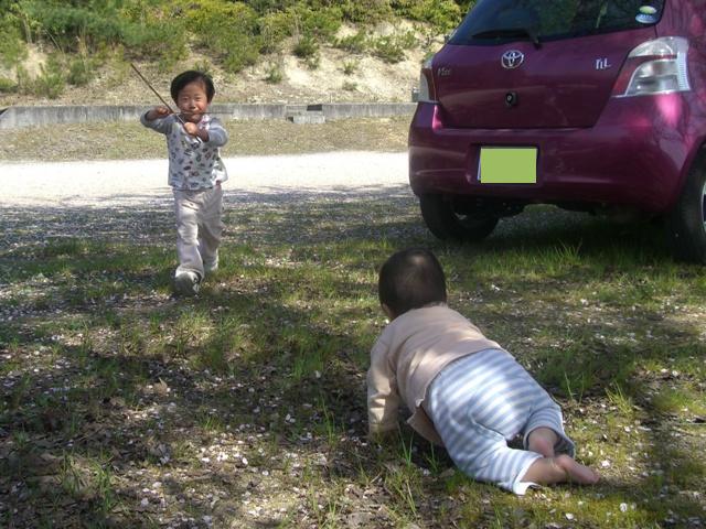 おまけに次男まで、シートから脱走して土の上を這い回って・・・