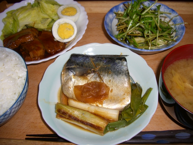 さばの味噌煮に添えているねぎは、白い部分をフライパンで焼いて